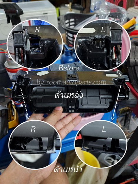 ตัวนี้เป็นมาตั้งแต่รับรถ ช่องแอร์กลางจะไม่ค่อยแนบสนิทชิดขอบเท่าไร พอรถสะเทือนก็จะไหลออกมา สาเหตุมาจากอายุรถที่มาก + พลาสติกรีไซเคิล + การเซอร์วิสหลายครั้ง เช่น ซ่อมแอร์เปลี่ยนตู้ เปลี่ยนจอวิทยุ ติดตั้งเครื่องเสียงเพิ่ม ทำให้ขายึดช่องแอร์กรอบแตก จึงได้ทำการรื้อซ่อมขายึด โดยการใช้สแตนเลสฉากรูมาทาบตัดให้พอดี ขยายรูให้ตรงตามตำแหน่งเดิม จากนั้นขูดผิวสแตนเลสให้เป็นรู + ใยสำลี + หยอดกาวให้ตรงตำแหน่ง จากนั้นใช้กระดาษเช็ดชูตัดเป็นเส้นหยอดกาวให้ครบทุกด้านเพื่อทำโครง จากนั้นค่อยๆ ไล่เอาสำลี หยอดกาวจนเต็มทุกด้าน รอกาวแห้งขายึดจะแข็งแรงมากๆ ครับ