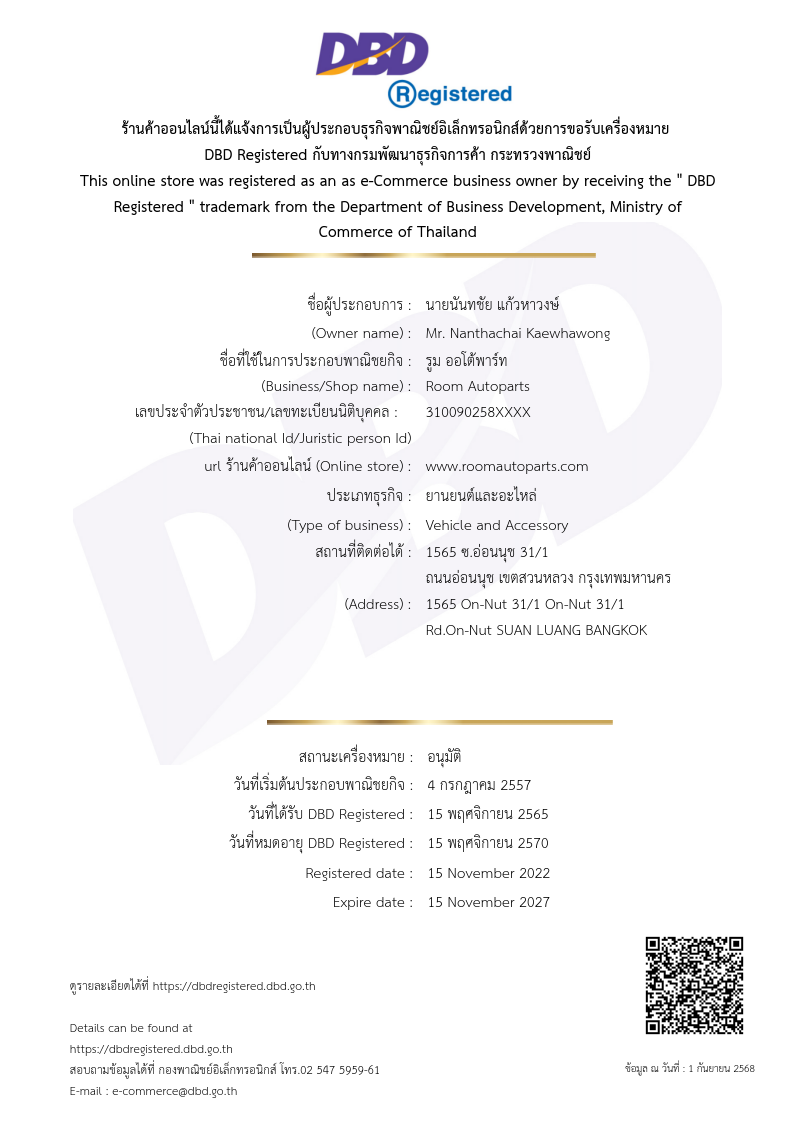 แผนที่- ธ.กสิกรไทย(K-Bank) ร้านรูมออโต้พาร์ท 635 248 0949 (หรือผ่าน QR Payment K-Shop)